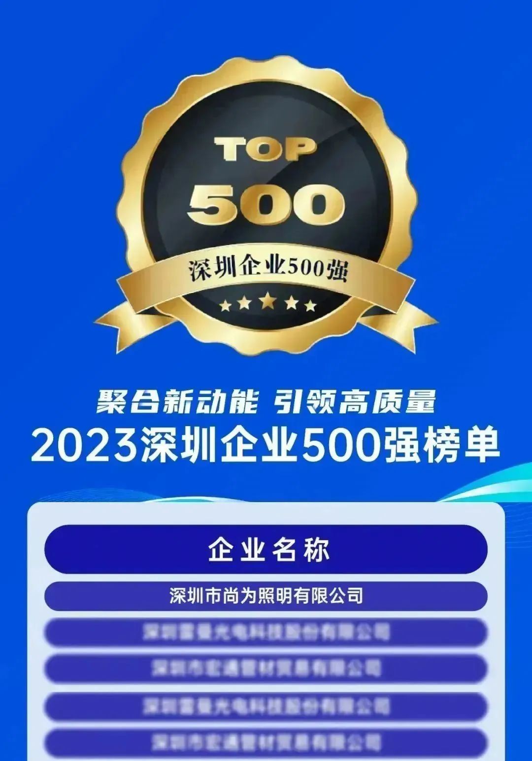 近日,深圳市企業(yè)聯(lián)合會、深圳市企業(yè)家協(xié)會聯(lián)合發(fā)布了“2023深圳企業(yè)500強榜單”及《深圳 500 強企業(yè)發(fā)展報告》,深圳市尚為照明有限公司連續(xù)四年位列榜單之內(nèi),保持著強勁、穩(wěn)定的發(fā)展。報告指出,上榜企業(yè)創(chuàng)新能力有所提升、數(shù)字化升級建設(shè)普遍增強,包括尚為照明在內(nèi)的“專精特新”類企業(yè)成為重要成長力量。尚為始終堅持“黨建引領(lǐng)高質(zhì)量發(fā)展”,以科技創(chuàng)新驅(qū)動企業(yè)發(fā)展,秉承愛國愛民理念,深耕工業(yè)照明領(lǐng)域,推動健康照明行業(yè)...